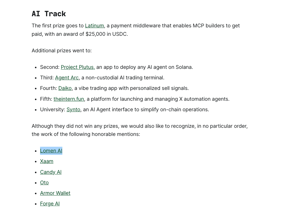 Lomen AI entered Colosseum Breakout hackathon and received an honorable mention.